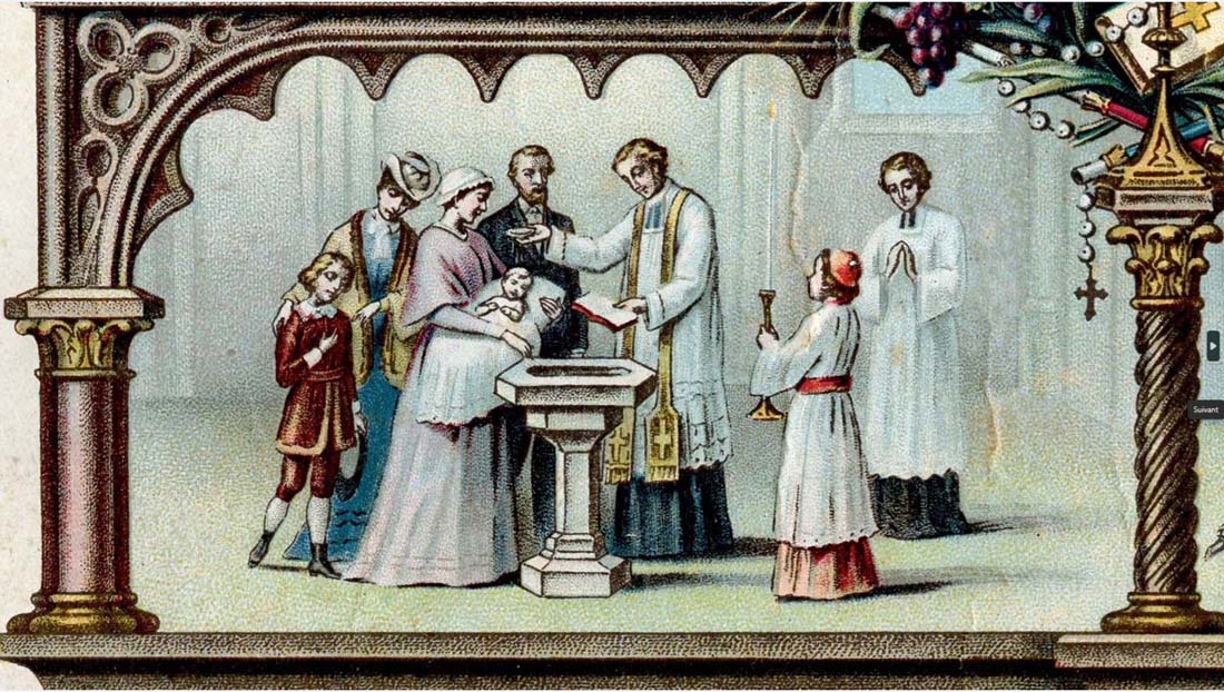 Les personnages portent des vêtements du XIXe siècle. Le bébé porte une robe de baptême qui se transmet de génération en génération.
