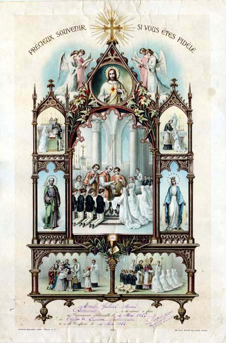 Cette image est extraite d'un diplôme de communion de 1922 remarquablement bien préservé. L'éditeur était la maison BOUASSE-LEBEL, spécialiste des publications religieuses, dont le catalogue de 1859 est en ligne dans la Bibliothèque Nationale de France / Gallica.