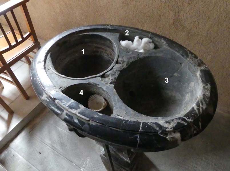3 : évacuation. Le prêtre verse l'eau bénite sur la tête penchée du baptisé. Au fond, il y a un petit trou d'évacuation pour que l'eau coule dans le sol.