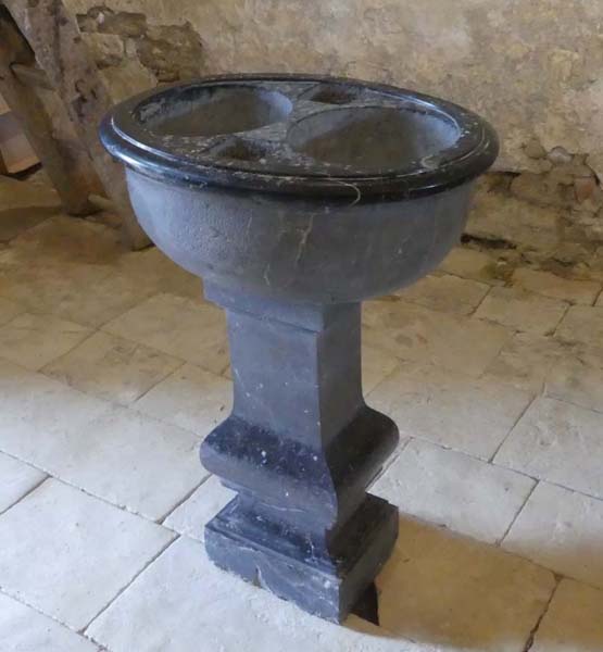Les fonts baptismaux. Ici, provenant probablement de la carrière de marbre de Sablé-sur-Sarthe.
