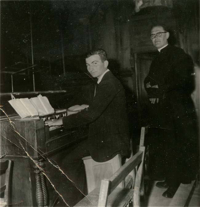 Michel GOURÉ (1925-2030), à la fois chantre et joueur d'harmonium, ici vers 1950. Il y avait deux harmoniums dans l'église de Louresse. L'autre harmonium était tenu par Denise, l'épouse de Michel GOURÉ (née BRIAND). Pour certains cantiques les deux harmoniums se répondaient.