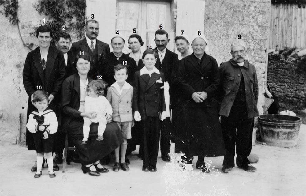 Année 1936. Cette photo montre l'importance de la communion solennelle dans la vie d'une famille. Joseph BINARD (n°6) était un ouvrier agricole venu du Morbihan pour s'installer à Rochemenier. Cette immigration franco-française venue de Bretagne était très commune en Anjou. En effet, les salaires y étaient plus élevés qu'en Bretagne. Joseph a épousé Marie Alexandrine BEGAULT (n°7) issue d'une vieille famille du village. Elle était veuve d'un soldat (Georges PINSON) tué à la guerre de 1914-18. Elle n'avait pas eu d'enfant de son premier mariage, mais avec Joseph elle a eu deux fils : Joseph (n°13) et Yves (n°14). La grand-mère du communiant (n°4 - Anne Marie BINARD-ORHAN) est venue seule du Morbihan pour cet évènement exceptionnel. Elle avait 61 ans. Elle était veuve. C'était compliqué. On ne voyageait pas aussi facilement qu'aujourd'hui. La communion solennelle était, après le mariage, l'évènement familial le plus important qui incitait la famille à venir de loin. Même pour un baptême on ne venait pas aussi facilement car la date ne pouvait pas être fixée longtemps à l'avance. En effet on baptisait souvent le nouveau né peu de temps après la naissance à cause du risque de mortalité enfantine.