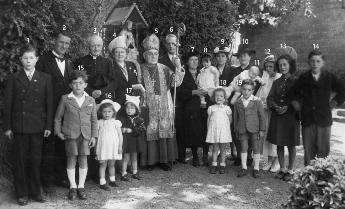 La confirmation de 1947 à Louresse. La venue d'un évêque dans une petite paroisse est un évènement. C'est l'occasion pour une famille nombreuse de se faire prendre en photo autour de l'évêque.