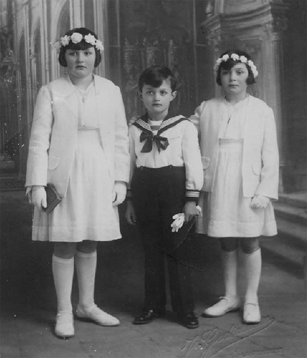Année 1932. A gauche tenue de confirmation. A droite tenue de communion privée. Il n'y a pas de différence. Les tenues sont plus simples que pour la communion solennelle. Le petit frère, au centre, a été invité pour figurer sur la photo. Remarquez dans sa main des gants blancs comme pour un marié.