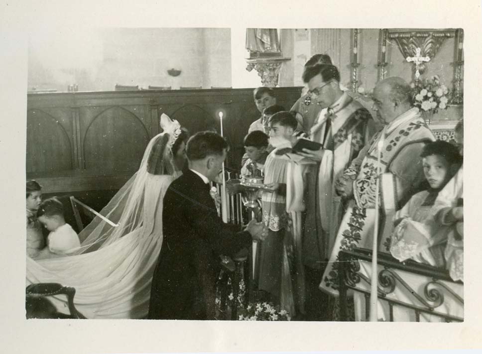 Mariage inconnu vers 1945. Il y a trois prêtres et au moins six enfants de choeur, ce qui est rare.