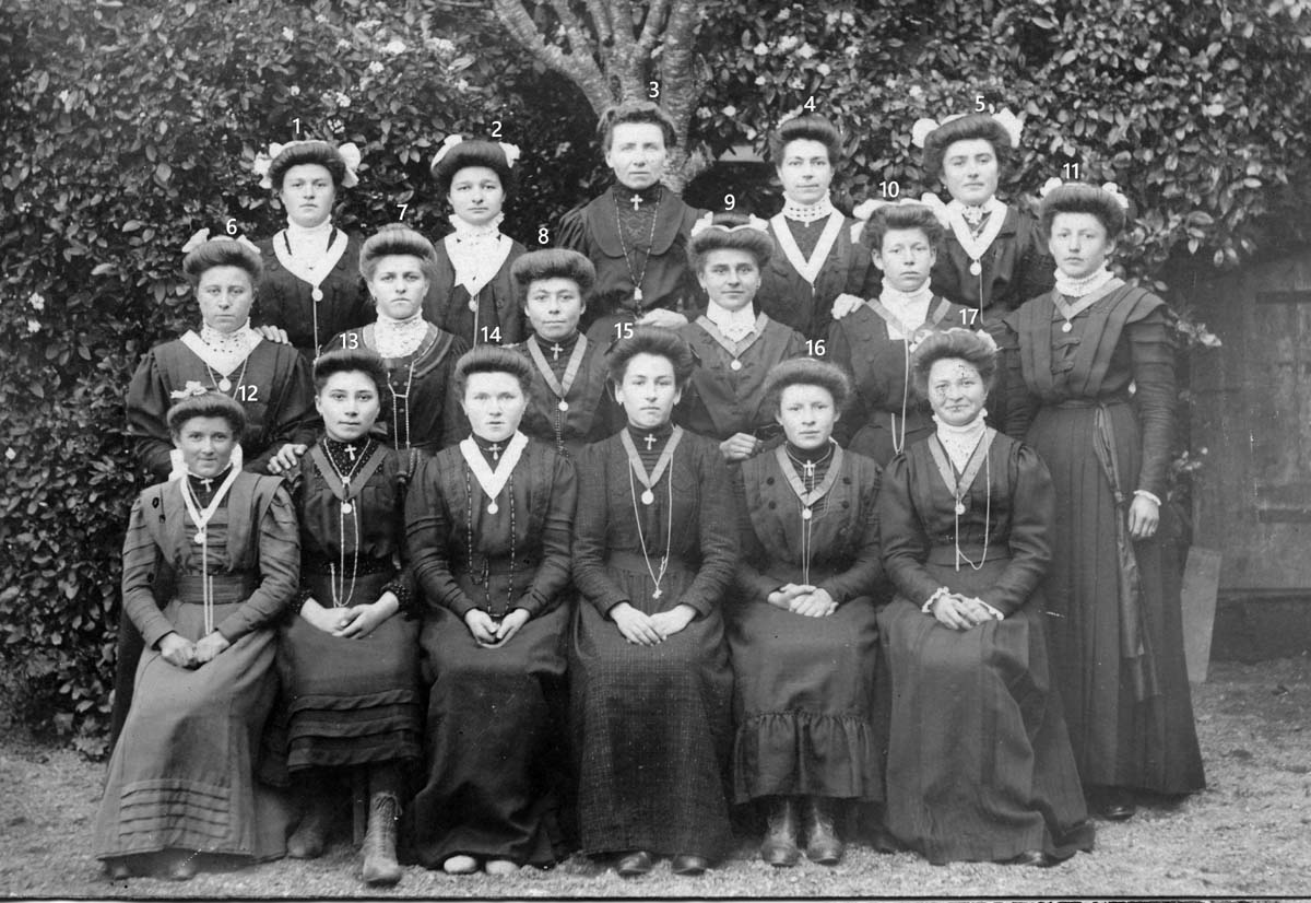 Les jeunes filles ont mis leurs plus beaux vêtements pour la photo. Elles portent une médaille au cou, et plusieurs d'entre elles portent un collier sautoir qui était à la mode à cette époque-là.