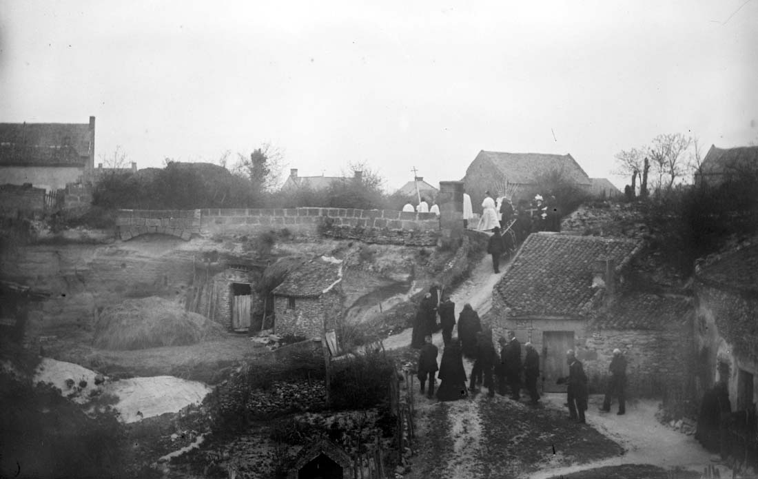 Dans les villages les photos d'enterrement sont rares. En effet, les photos sont plutôt associées à des évènements heureux. Ici, il s'agit d'un enterrement à Rochemenier vers 1910. Le défunt habitait dans une maison semi-troglodytique en bas à droite. Le cercueil est couvert d'un drap mortuaire. Il est porté sur un brancard funéraire car, l'église étant à seulement 100 mètres, il n'y avait pas besoin de corbillard. Le prêtre est coiffé d'une "barrette" (bonnet carré). Les enfants de choeur sont en tête du cortège et portent un crucifix.