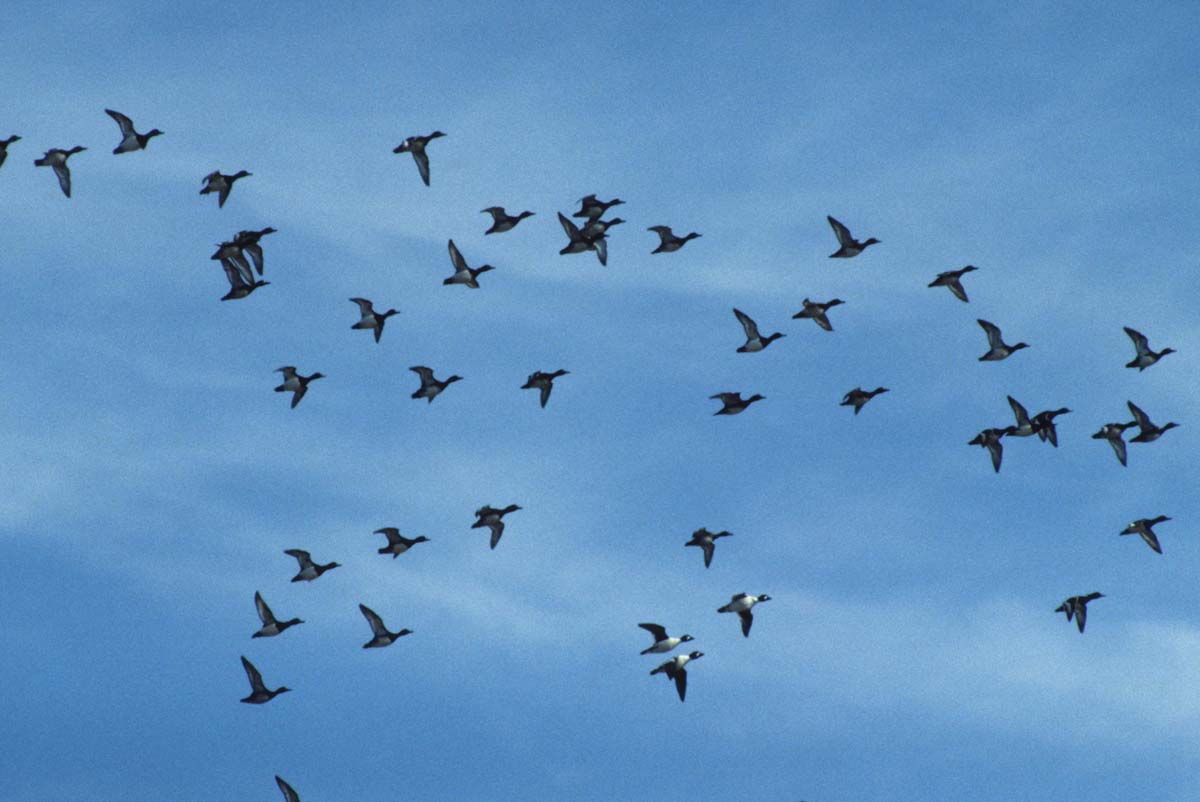 Fuligules morillons et trois Garrots à oeil d'or en bas.