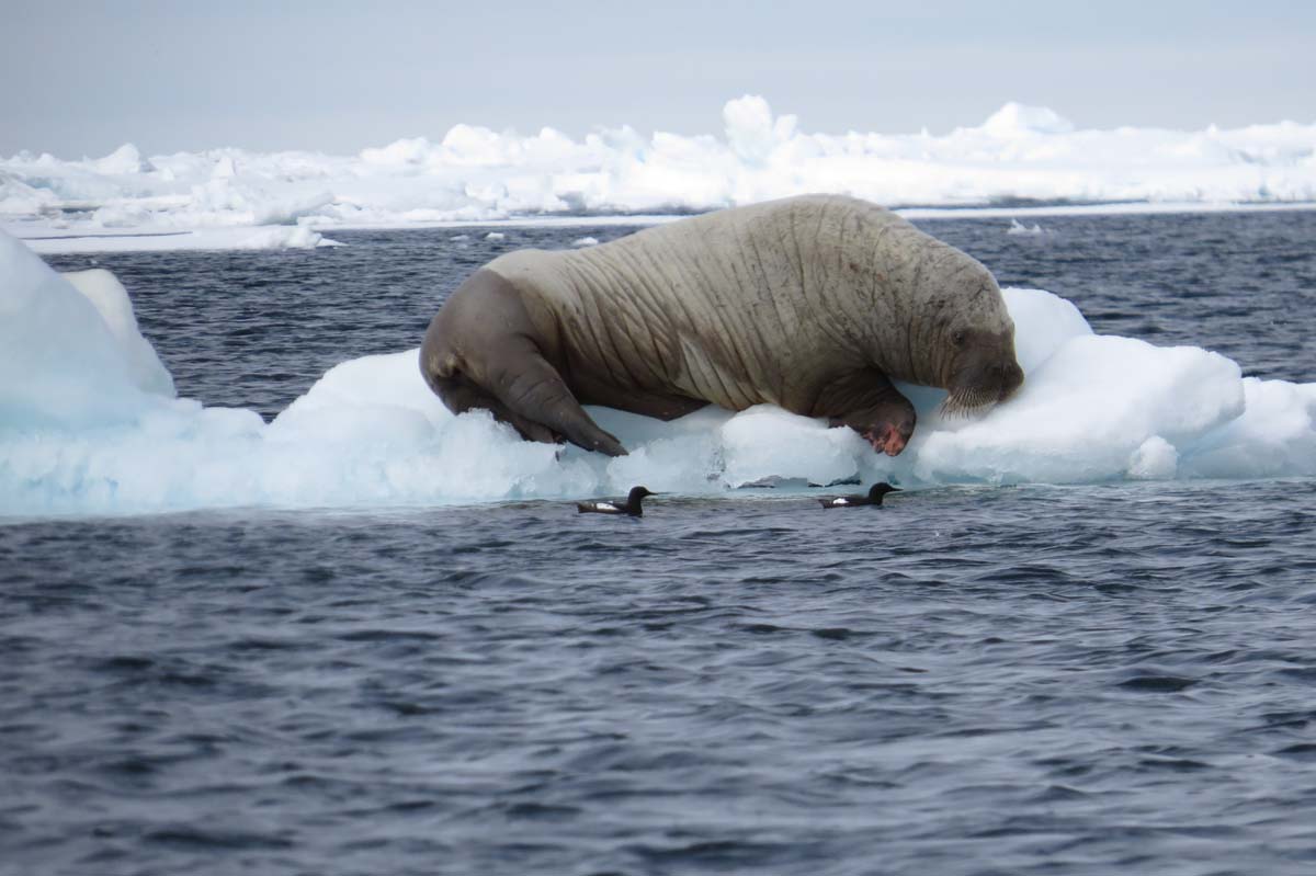Jeune morse. Pelage plutôt gris argenté et défenses très courtes.