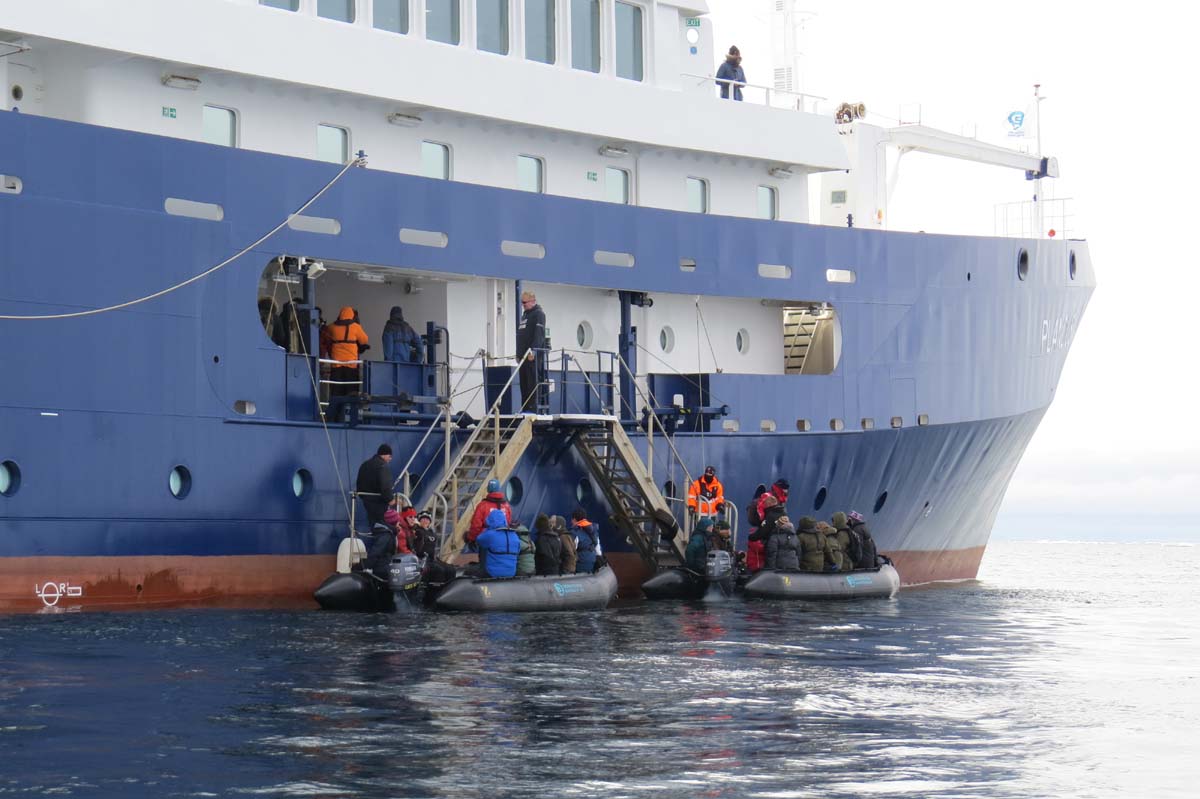 La manoeuvre des Zodiacs est bien organisée. Les Zodiacs sont ensuite montés sur le pont arrière à l'aide d'une grue.