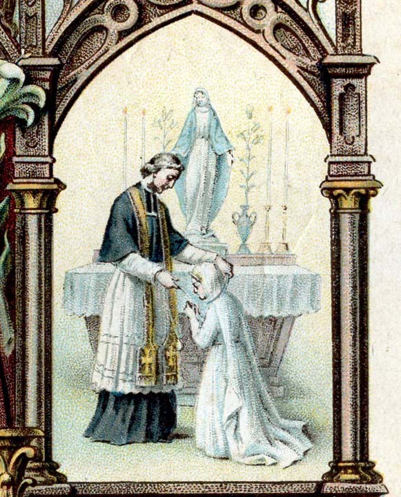 Extrait d'une gravure de 1922 avec une illustration du XIXe siècle. Il s'agit probablement d'une consécration à la Vierge Marie, dont on voit la statue en arrière-plan. On dirait que le prêtre passe symboliquement un cordon autour du cou de la jeune fille qui est habillée en communiante. La jeune fille est ainsi liée par serment et s'engage à honorer la Vierge Marie toute sa vie. Elle pourra ainsi entrer dans l'association des Enfants de Marie. On y entre officiellement à l'âge de 14 ans mais on peut assister aux réunions après avoir fait sa communion solennelle.