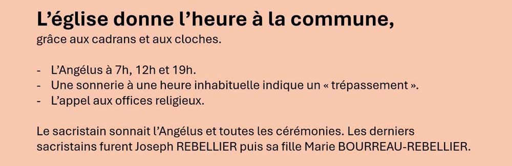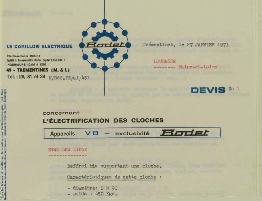 L'électrification de la cloche n'a été faite qu'en 1973. On voit sur ce devis le poids de la cloche : environ 450 kg. Les sacristains (et la sacristaine) arrivaient à faire sonner la cloche à la volée en tirant sur une corde. Il y avait un bras de levier efficace au niveau du mouton de la cloche (pièce de bois avec un axe où est fixée la cloche).