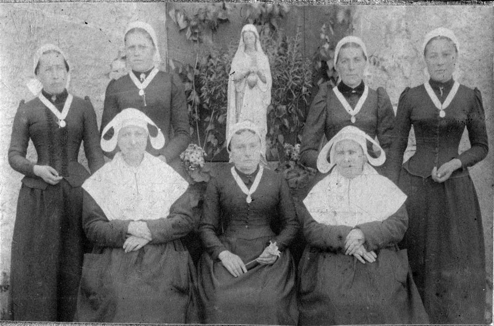Avec les soeurs de la Congrégation de Saint Charles à Louresse. La 3e en haut à partir de la gauche est JAUNAULT Lucie, future épouse de BRETON Charles et mère de BRETON Emile qui fut maire de Louresse. La photo est prise devant une statue de la Sainte Vierge. Les Enfants de Marie portent une médaille au cou.