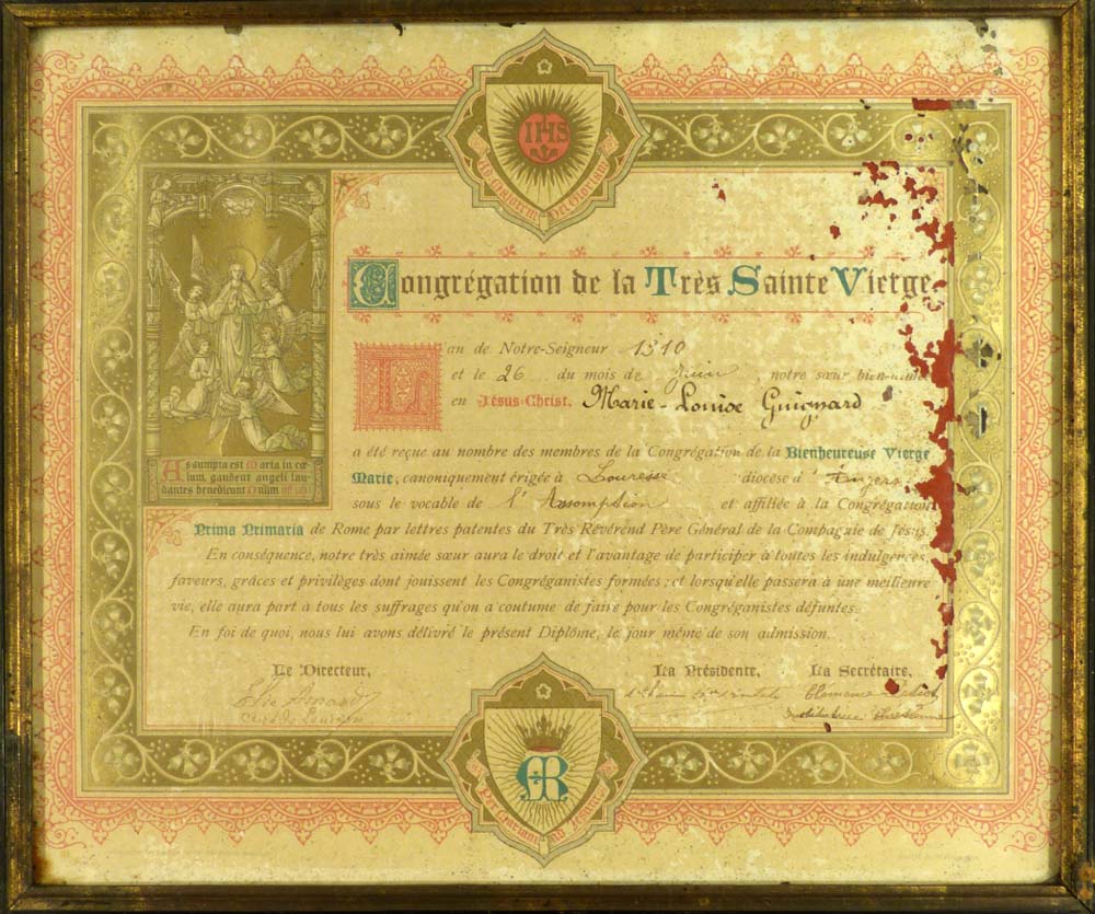 Ce document est un diplôme d'appartenance aux Enfants de Marie. Marie-Louise Guignard s'est mariée le 26 avril 1920 avec Elie Fradin.