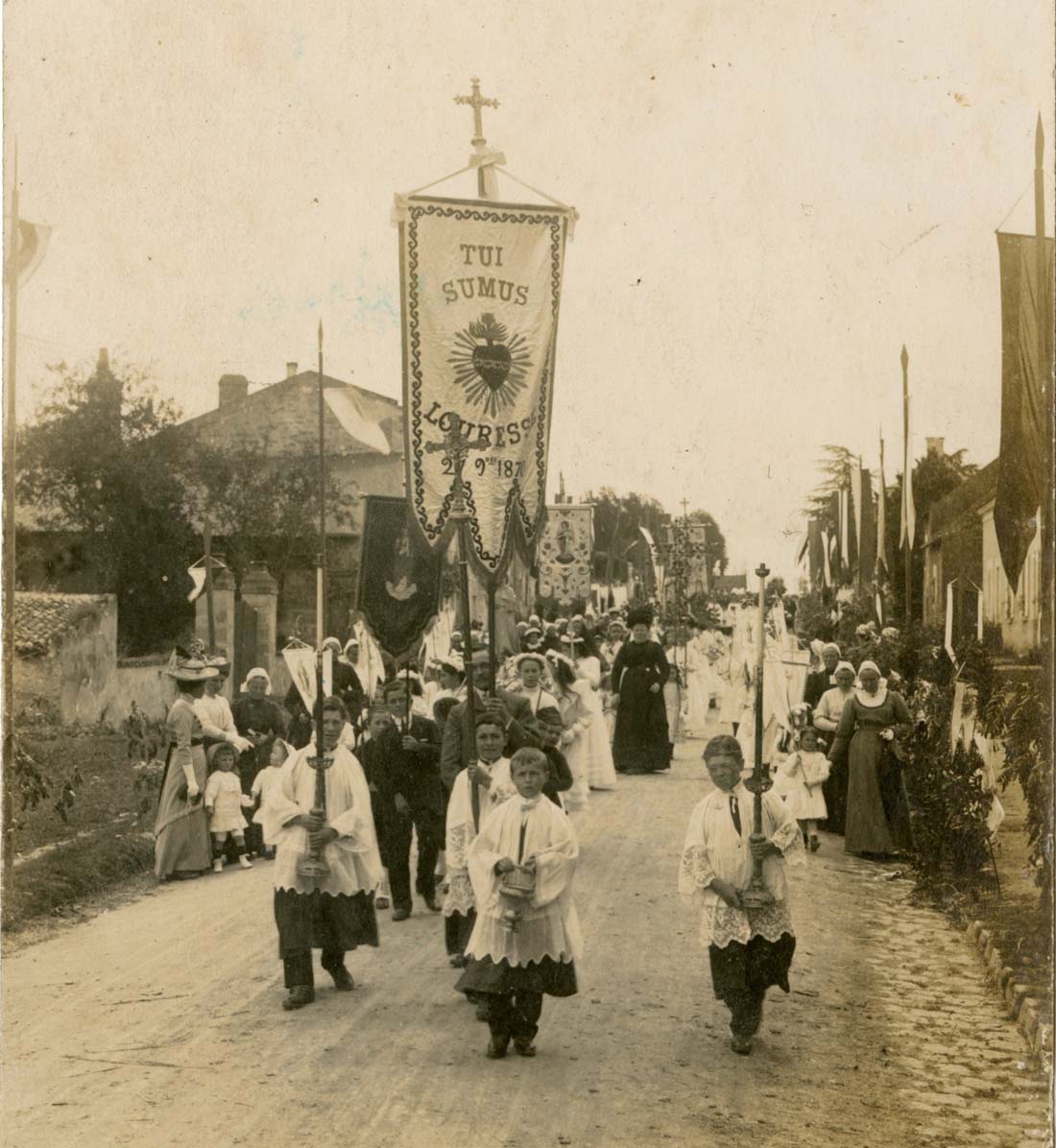 Procession de la Fête-Dieu vers 1900, rue Principale à Louresse. On ne voit pas le Suisse mais il est peut-être déjà passé en tête de la procession. Juste derrière les bannières on aperçoit quelques petits zouaves pontificaux suivis par les jeunes filles en tenue de communiantes. Remarquez les décorations sur les côtés de la rue.
