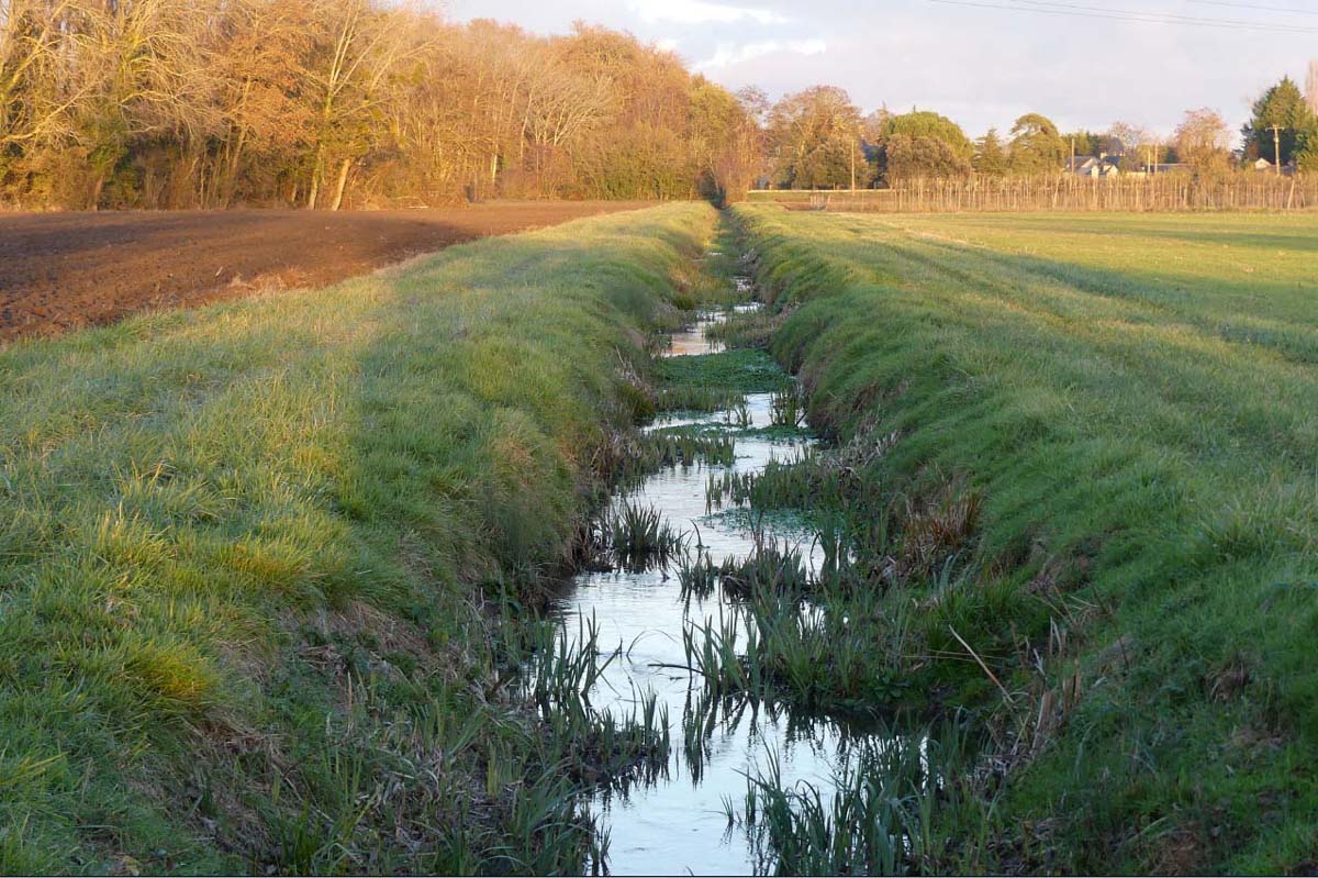 Le nouveau ruisseau parallèle au bief, pour évacuer l'excédent d'eau du bief et aussi favoriser le drainage des terres agricoles. Il se jette dans le Douet à 3 km en aval. Les bâtiments au fond à droite font partie du château du Pont de Varanne.