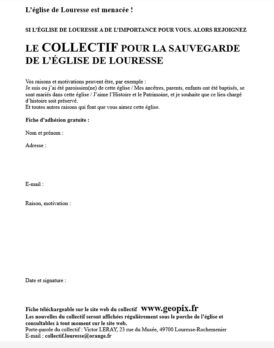 Les paroissiens considèrent que l'église est en danger. C'est la raison pour laquelle nous avons décidé de créer le "Collectif pour la sauvegarde de l'église de Louresse". C'est la réunion de tous ceux, Louressois ou non Louressois, qui aiment cette église. C'est une sorte de comité de soutien. Pour beaucoup, elle a une valeur sentimentale car leurs enfants, parents et ancêtres y ont été baptisés, s'y sont mariés et ont eu leur cérémonie d'inhumation. Pour d'autres c'est un lieu chargé d'histoire qu'il faut préserver. Pour d'autres encore c'est le symbole de la ruralité et de nos racines. Plus nous serons nombreux dans ce collectif, plus nous serons écoutés. En adhérant, chacun exprime son désir de voir l'église entretenue et restaurée. Mais pas seulement. Trop de décisions concernant cette église ont été prises sans concertation des principaux intéressés, c'est à dire les paroissiens. Dorénavant nous demandons à être informés de tout ce qui concerne l'église. Une lettre d'information sera diffusée aux adhérents dans le site web du collectif à chaque fois qu'il le faudra. Certes, le collectif sera le défenseur de l'église, mais il servira aussi à proposer des solutions et appuiera la municipalité dans les recherches de financements, de subventions et de mécénat.